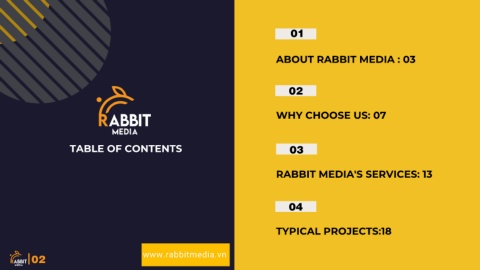 01 ABOUT RABBIT MEDIA : 03 02 WHY CHOOSE US: 07 TABLE OF CONTENTS 03 RABBIT MEDIA'S SERVICES: 13 04 TYPICAL PROJECTS:18 02 www.rabbitmedia.vn